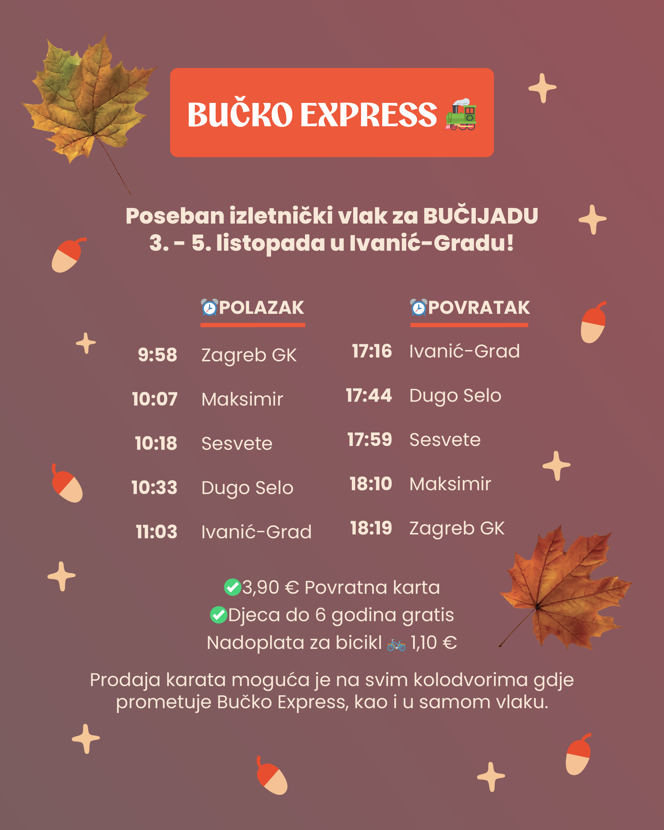 Važno: Na zahtjev Turističke zajednice Ivanić-Grada vožnja Bučko-expressa zakazana za 5. listopada otkazuje se zbog loše vremenske prognoze. Molimo putnike koji su kupili karte za navedenu vožnju da povrat novca zatraže na blagajnama.